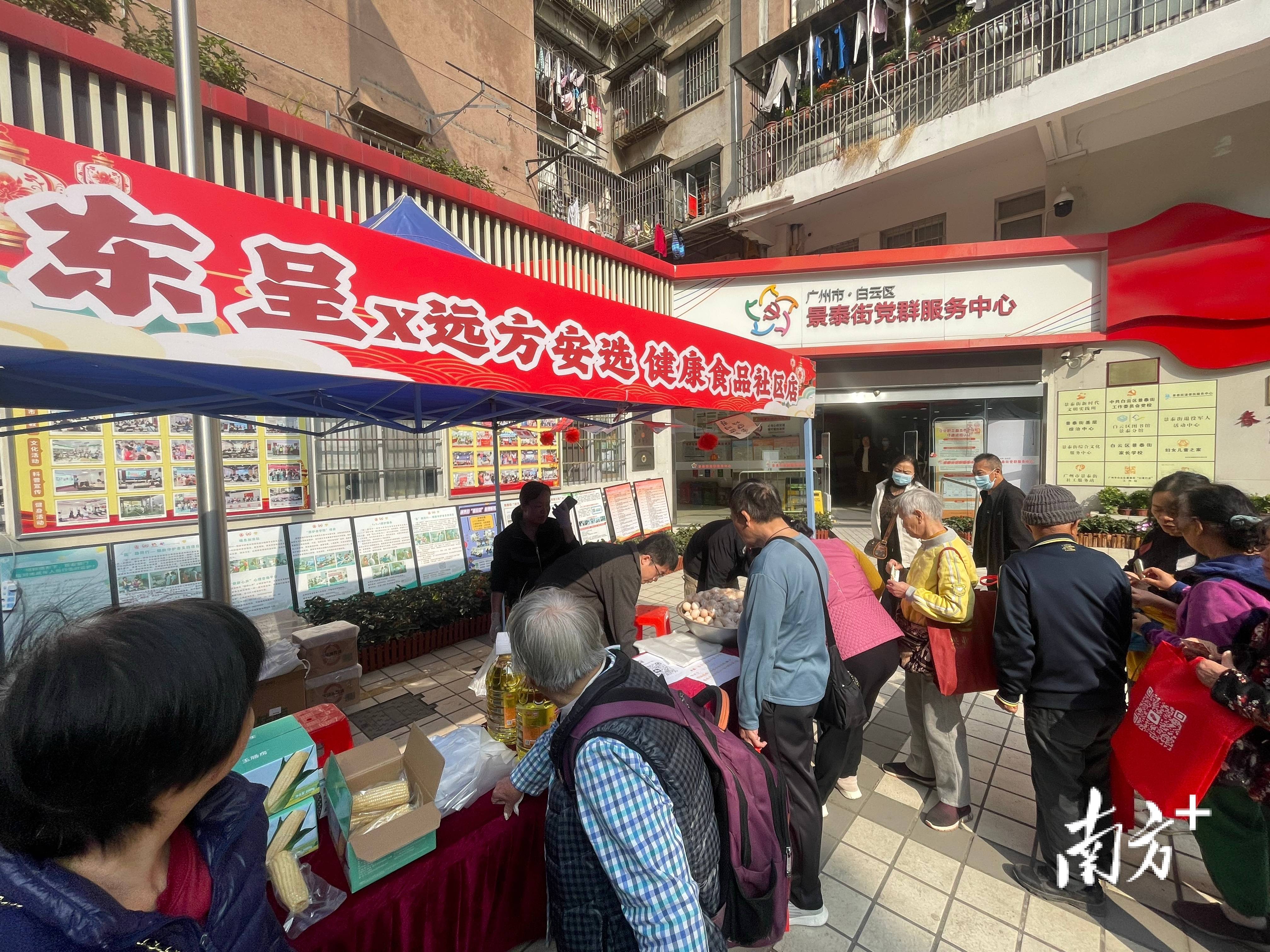 社区服务中心内,东呈集团统筹的东呈x远方健康食品社区店、广州市奶牛研究所有限公司、广东区域协作消费帮扶产品交易中心热闹开张,食品展示区琳琅满目,牛奶、鸡蛋、新鲜蔬菜堆得满满当当,居民穿梭其中,精心挑选着心仪的年货;